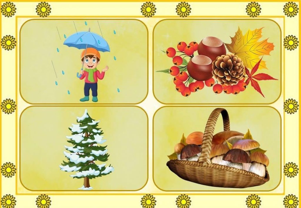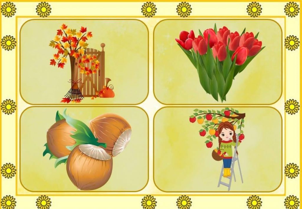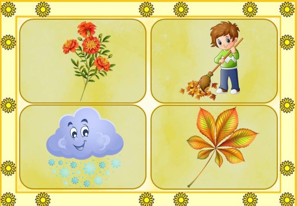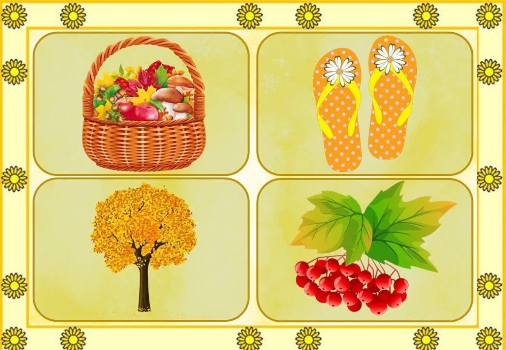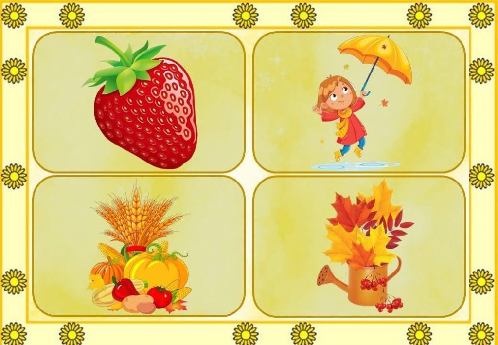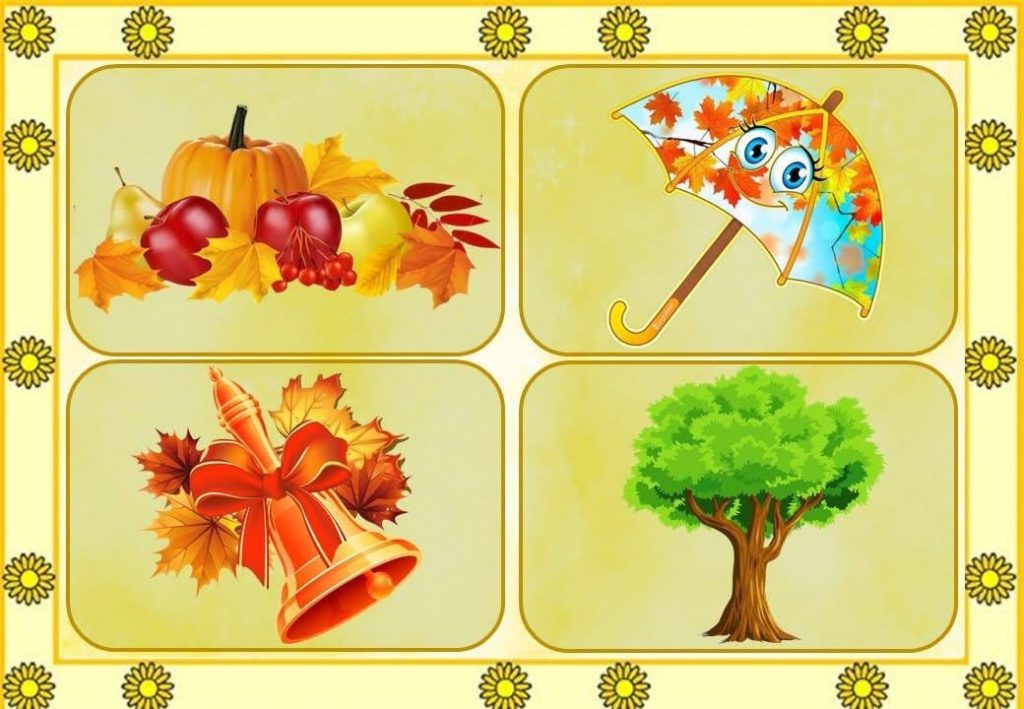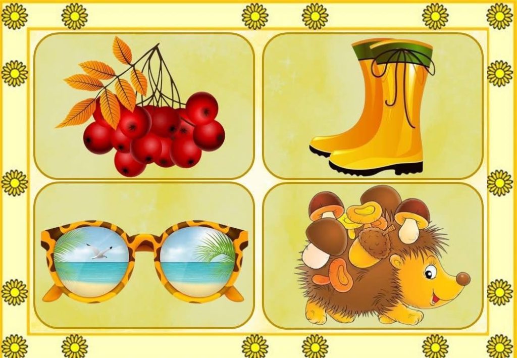 Мета: закріпити знання дітей про осінь та осінні явища; навчати визначати ознаки осені й знаходити зайві предмети; розвивати зв’язне мовлення, логічне та діалогічне мислення, увагу й пам’ять.